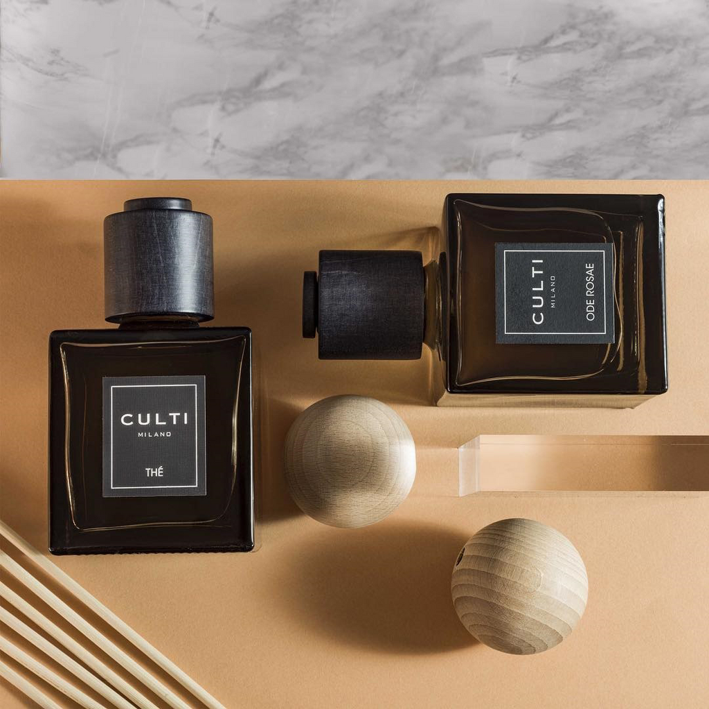 Sculpted, square-shaped bottles in thick glass with Dark Brown maple wood cap. The bold, distinct features of the CULTI DECOR line add a touch of character to any room. Aqqua: A wide-open sea view, one glance sweeping across the bay, the mountain sliding into the deep blue, and the villages perched up high, resembling a painting. A place of natural elegance with a vigorous, almost physical energy.