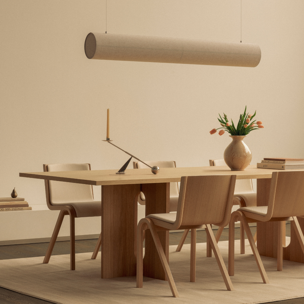 Designed to bring serenity and sophistication to a space, ideal over a dining table or desk, the Hashira Linear Pendant Lamp redefines the popular lighting collection with its horizontal form, delivering ambient lighting in a minimalist aesthetic. The streamlined lamp appears to float on air, suspended from the ceiling by wires and its raw linen shade held in place by magnets, eliminating the need for bulky screws. The dimmable, replaceable LED light source emits a warm glow, bright enough for tasks yet subtle enough to add ambience.