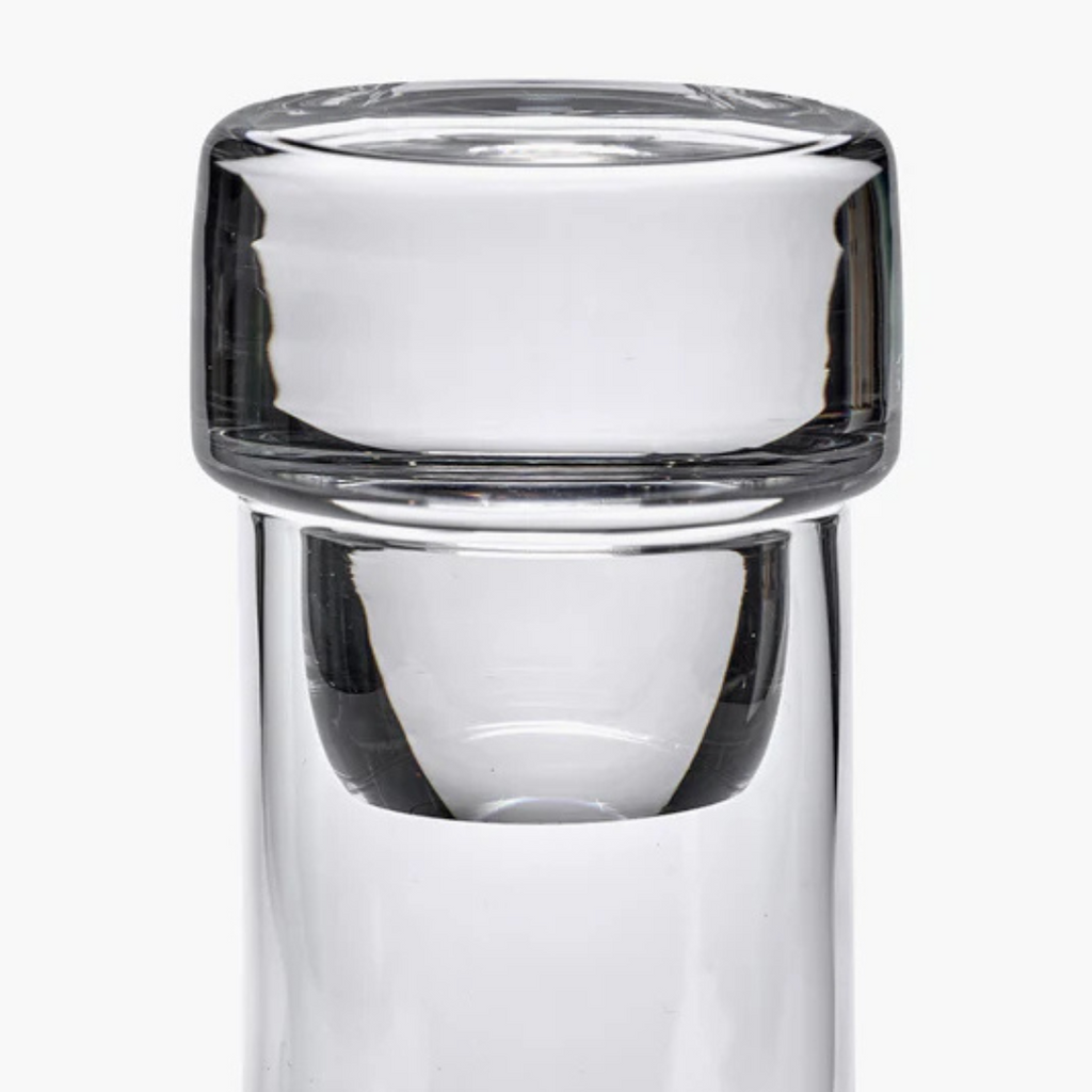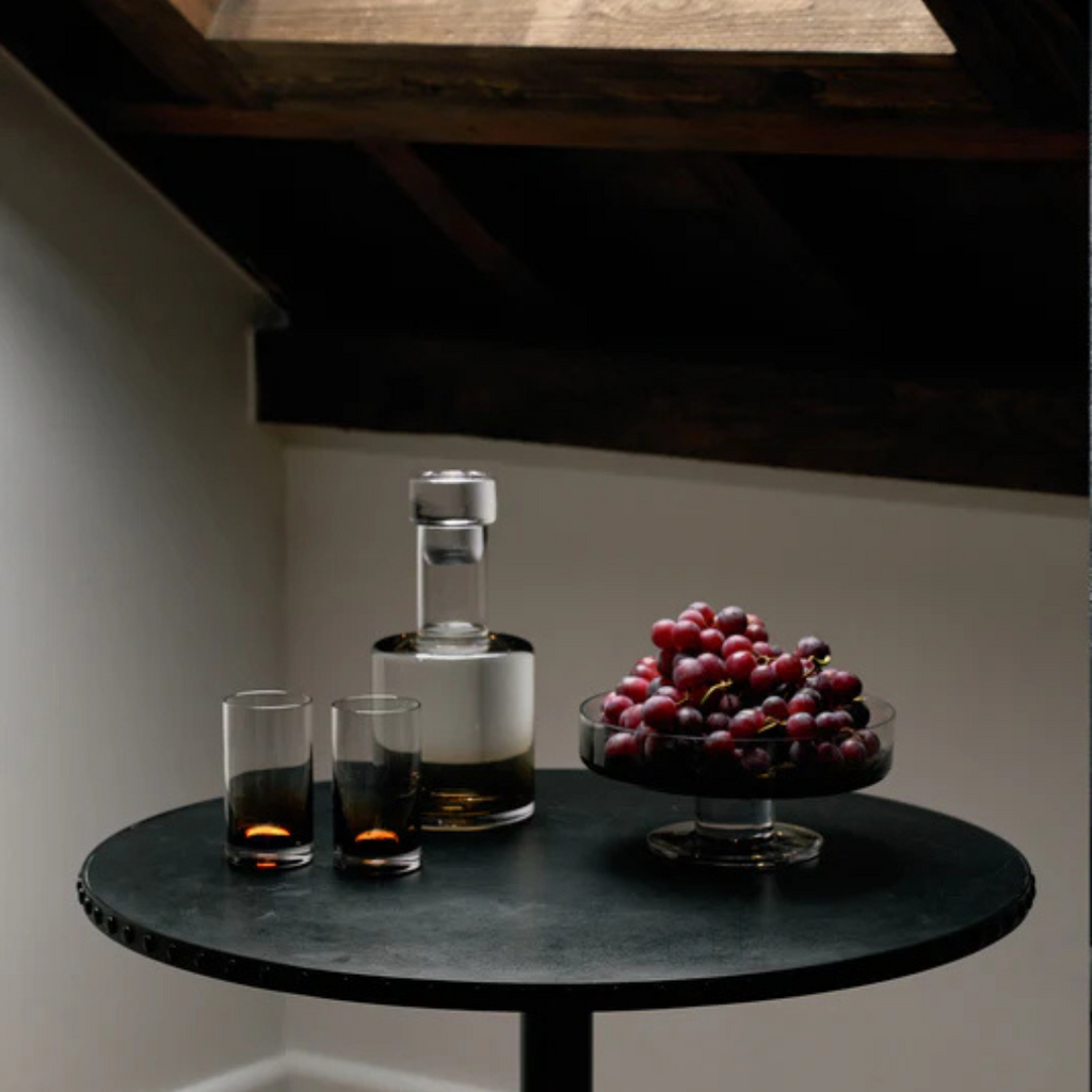 The Zuma Carafe by Kelly Wearstler features a warm amber tone, achieved through a three-layer glass technique. The subtle gradient recalls vintage glassware, contrasted by a thick base and clean, modern lines.